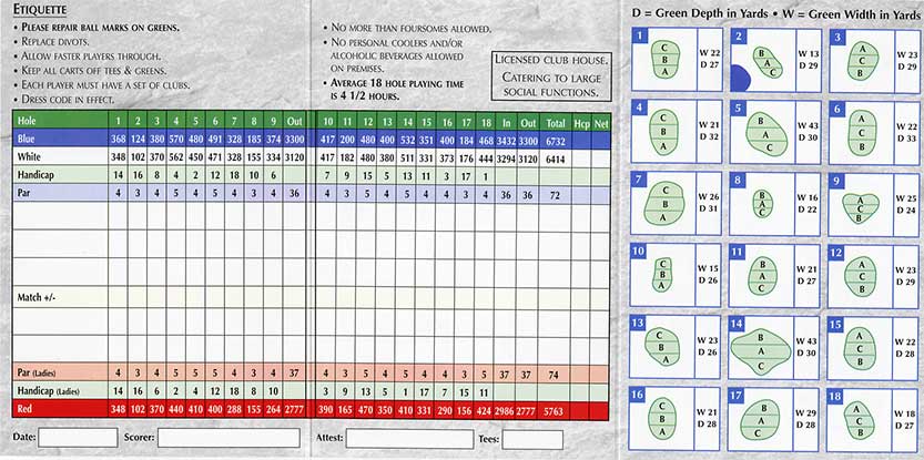 Blue Tees – Rating: 70.7/123 (M), 76.6/132 (W) – Yardage: 6,488